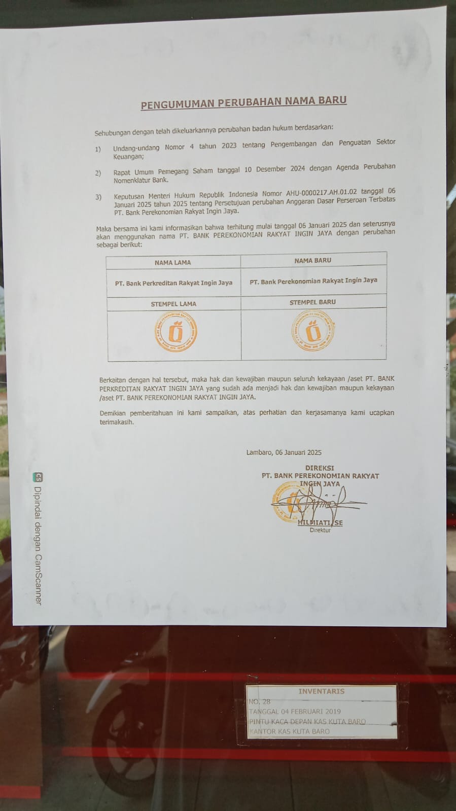 - Pengumuman Perubahan nama dari PT. ‘Bank Perkreditan Rakyat Ingin Jaya’ menjadi ‘PT. Bank Perekonomian Rakyat Ingin Jaya’